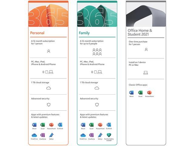 | Feature | Fully installed Office applications Get the installed applications you know and trust – Word, Excel, PowerPoint, OneNote, Outlook, Publisher, Access. Tooltip with details about Publisher and Access and current Office app versions Now includes the new Office 2016 apps for your PC and Mac. Subscription benefits for up to 5 users Work across multiple devices |