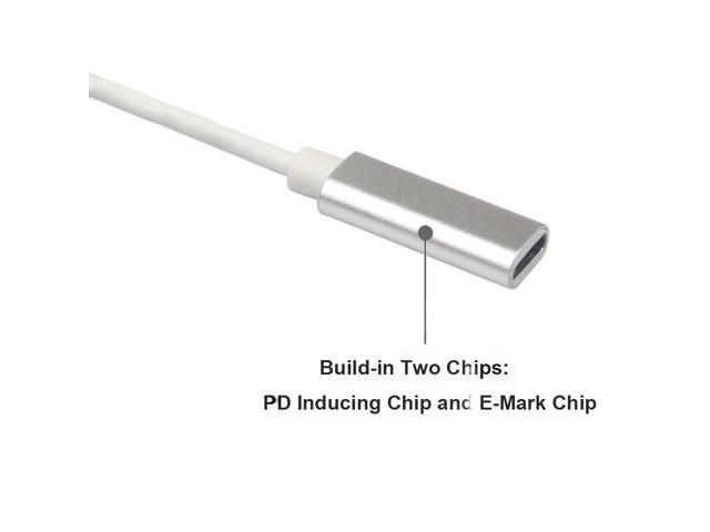 Name: 100W USB-C Female to MagSafe 2 (T-Tip) PD Charging CableInput Connector A: USB C FemaleOutput Connector B: MagSafe 2 (T-Tip)Input PD 15V~20V/3A~5ADC Output 15V~20V Max 100W to Magsafe 2 (T-Tip) ConnectorPower Requirement: Please Make sure the PD Charger have enough Power. ( We recommend to use Apple 87W original chargers or above, and the PD charger just only has one output port.)Color: WhiteMaterial: TPE (cable) Build-in the PD Inducing Chip and E-Mark Chip100% High Quality and Brand New