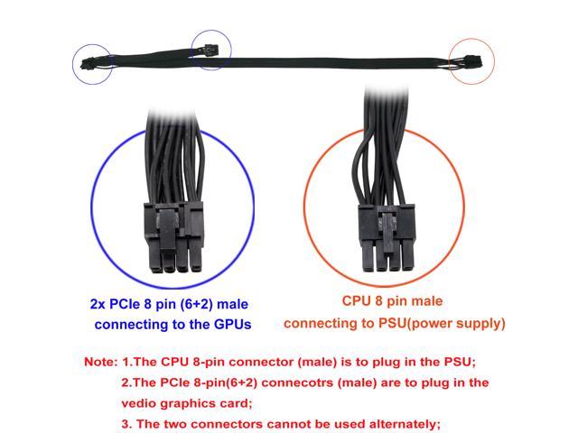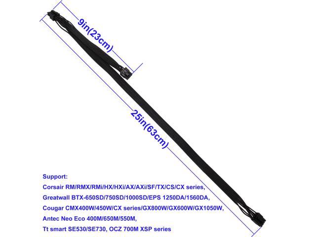ATX 8 pin male end to connect to the power supply (NOTE: 8 pin male connector is ATX 8 pin, not pci-e 8 pin.) and two PCIe 8 pin(6+2) male ends to plug into the video graphics card.(NOTE: the 8 pin end and two 8 pin(6+2) male ends cannot be used interchangeably); Compatible with 6-pin & 8-pin graphics cards from popular manufacturers such as: ASUS, ASRock, Gigabyte, Radeon, Sapphire, NVIDIA Tesla GPU, etc. (The 8 pin (6+2) ends could be used as 6 pin or 8 pin end by sliding on/off the 2 pin.); ONLY compatible with Corsair RM/RMX/RMi/HX/HXi/AX/AXi/SF/TX/TX-M/CS/CS-M/CX/CX-M series,Greatwall BTX-650SD/750SD/1000SD/EPS 1250DA/1560DA, Cougar CMX400W/450W/CX series/GX800W/GX600W/GX1050W,Antec Neo Eco 400M/650M/550M, Tt smart SE530/SE730, Thermaltake toughpower xt platinum 1275W/775W, OCZ 500M/700M XSP series;(NOTE: Do not work with AX1200.) Length(including connectors): 25-inch + 9-inch(63cm+23cm), Gauge: 1007-18AWG(standard tin-coating copper wire), Quantity: 1pcs, Self-adhesive tape*1