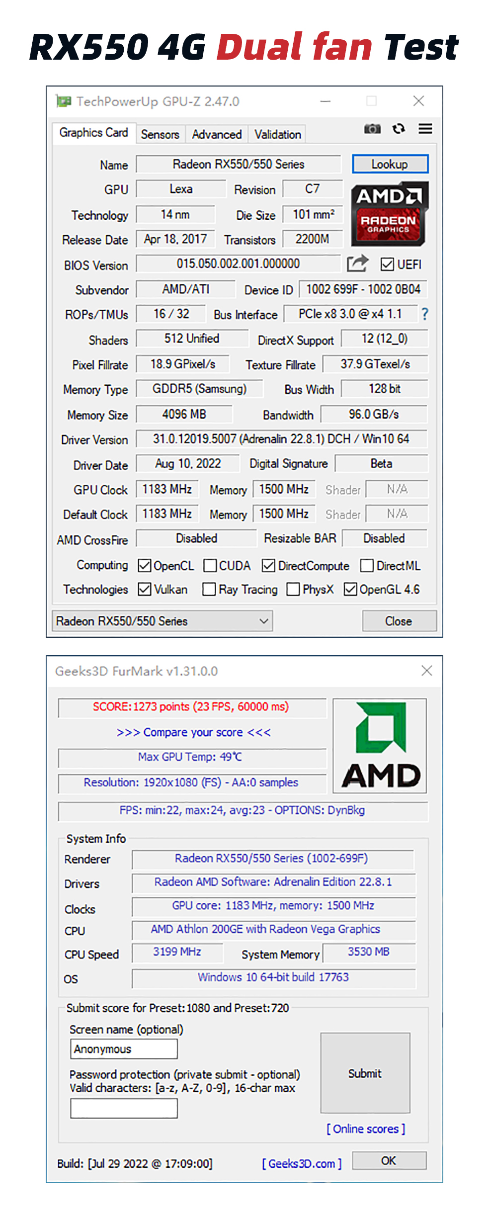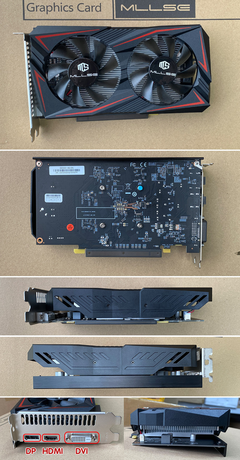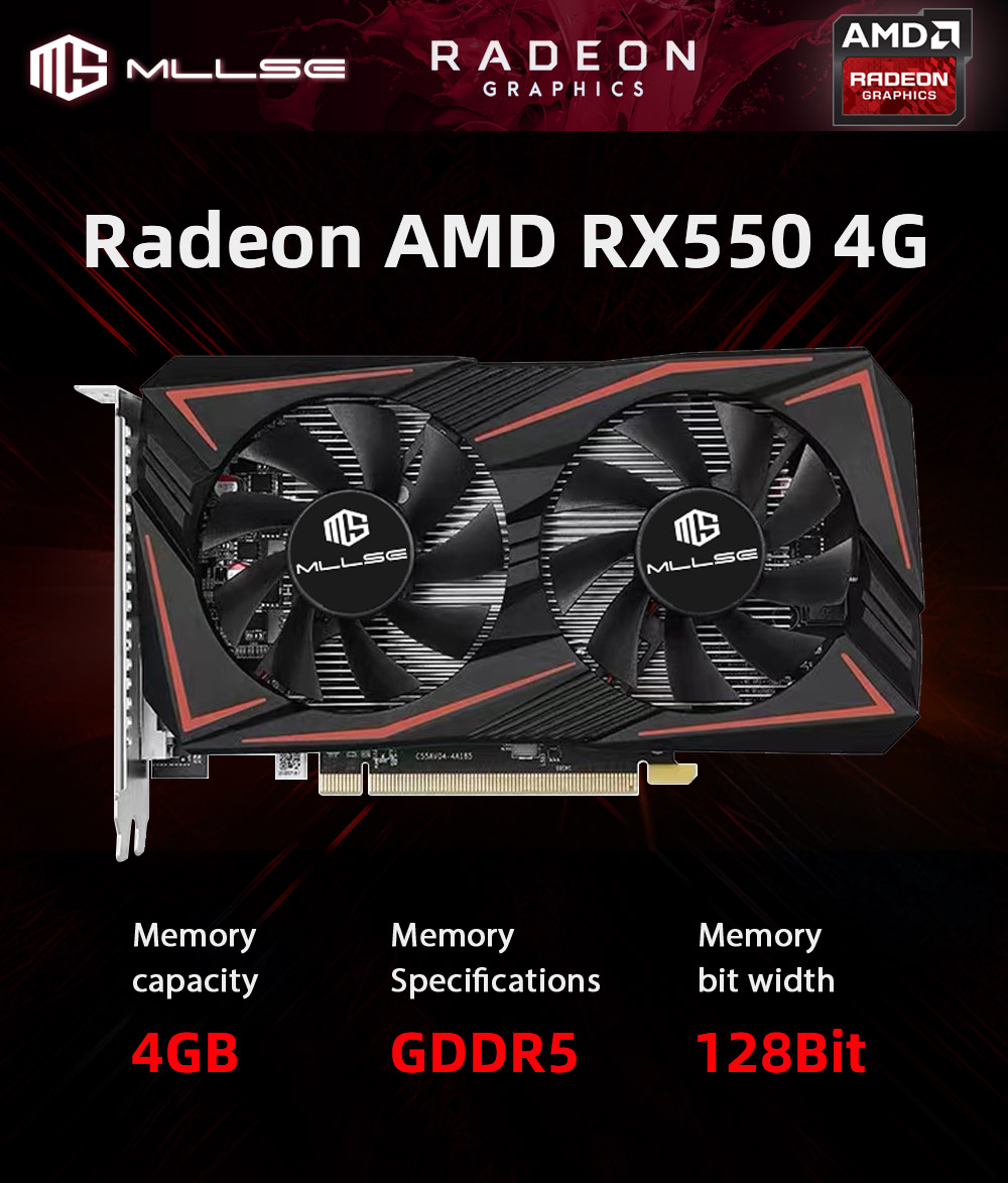 1.Brand Name: MLLSE Cooler Type: Double fan ,Product Features: PhysX, Video Memory Type: GDDR52.Usage Scenario: Gaming,Audio & Video,Household,Office, Chipset Manufacturer: AMD3.Chip Process: 14NM, GPU Model: Radeon RX550, Video Memory Capacity: 4 GB4.Output Interface Type: DVI-D,HDMI 1.4 x 1,DisplayPort x 1, Memory Interface: 128 Bit, Interface Type: PCI Express 3.0 X165.Memory Clock(Mhz): 1183MH, Core Clock(Mhz): 6000MHz, Warranty: 2 Years