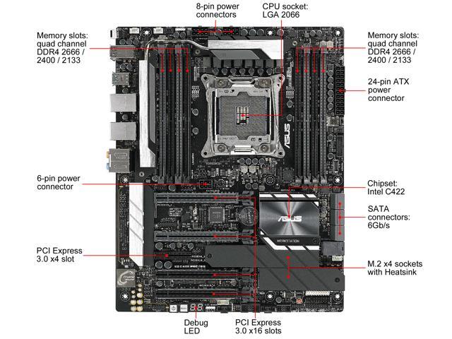 | Features | Storage: 1 x M.2 x4 Socket 3, with M key, type 2242/2260/2280/22110 storage devices support (PCIE 3.0 x 4 mode) 1 x M.2 x4 Socket 3, with M key, type 2242/2260/2280 storage devices support (both SATA & PCIE mode) 1 x U.2 connector Support Raid 0, 1, 10 Intel Rapid Storage Technology Enterprise supports Intel Virtual RAID (VROC) support for CPU RAID Powered by Intel Xeon W processor with ECC memory ASUS Control Center – A software utility that provides convenient, secure and cost-saving centralized IT management for small and medium businesses Server-grade design with built-in dual Intel Gigabit LAN Next-gen transfer speeds – Up to 32 Gbps dual M.2 and U.2, plus up to 10 Gbps USB 3.1 Type-A and Type-C connections Ultimate graphics power with 2/3-Way NVIDIA SLI and AMD Crossfire X Ultra-efficient VRM heatsink – Metal fin array connected to large surface area via a heatpipe tames C422 thermals to enable unthrottled performance |