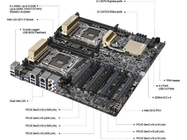 | SATA | Storage: 1.Intel® C612 chipset : 4 x SATA 6Gb/s port(s), gray, *3, 4 x SATA 6Gb/s port(s), black, *3, 1 x SATA Express port, gray, *4; 1 x M.2 Socket 3, *5 2.ASMedia® SATA Express controller : 1 x SATA Express port, gray, , Compatible with 2 x SATA 6.0 Gb/s ports |