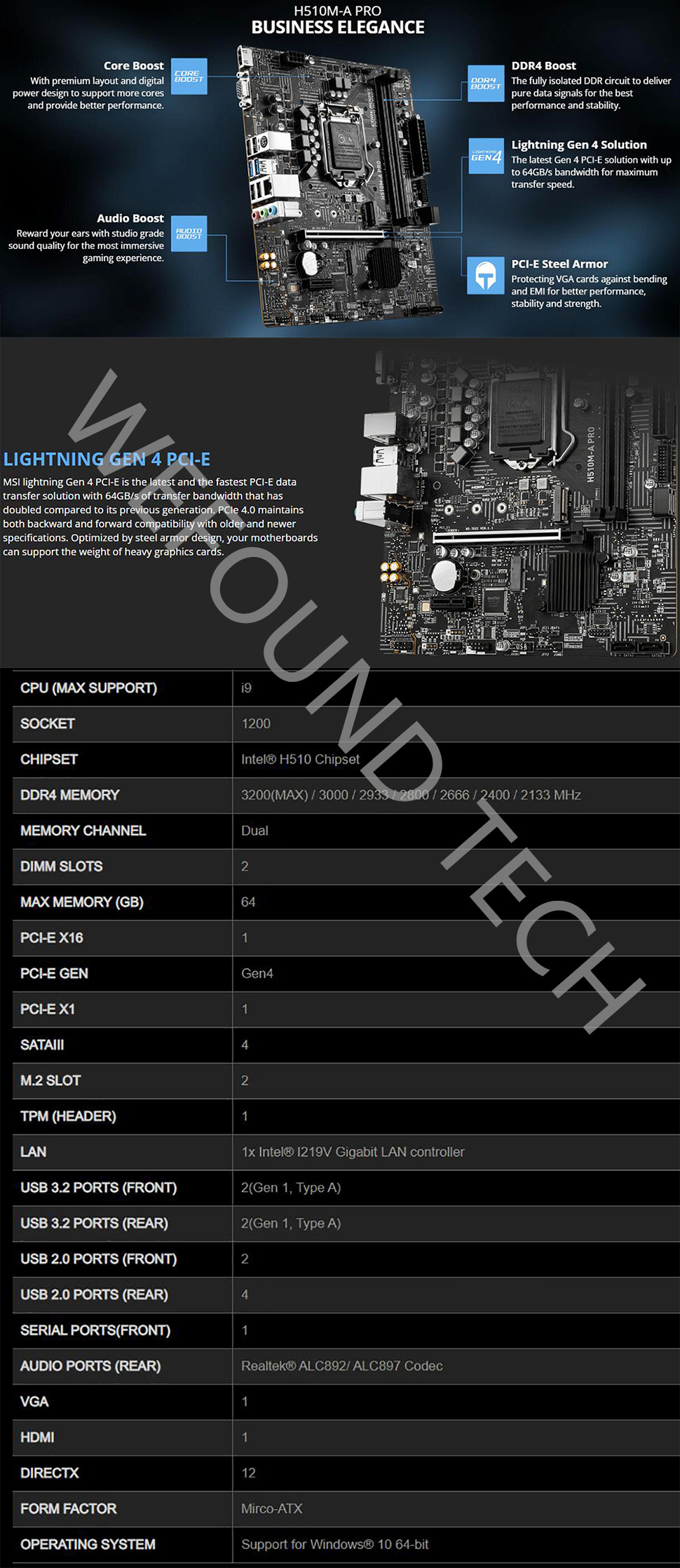 Supports 10th Gen Intel® Core Processors, 11th Gen Intel® Core Processors, Pentium® Gold and Celeron® ProcessorsIntel® H510 Chipset4x SATA 6Gb/s ports (From H510 Chipset) 1x M.2 slot (Key M)7.1-Channel High Definition AudiomATX Form Factor 9.29 x 7.95 in. (23.6 cm x 20.2 cm)