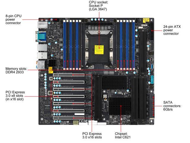 Intel C621 Socket P (LGA 3647), 1st and 2nd Generation Xeon Scalable Processor (Cascade Lake-SP) ReadyUp to 3TB ECC RDIMM / LRIMM DDR4 2933MHz in 12 DIMM slots7 PCI-Express 3.0 x16 slots for maximized expandability4 M.2 + 8 SATA both with RAID 0, 1, 5, and 10 optionsAquantia AQC107 10 GbE LAN and Intel i210AT GbE LAN2 rear USB 3.1 Gen2 + 1 Type A and 1 Type C Front Panel headerAI optimized, deep learning, simulation, and content creation