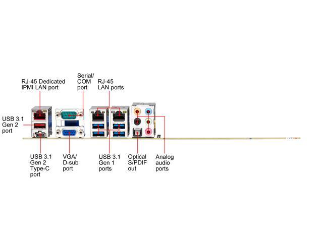 | Back I/O Ports | 1 x COM (Serial Port) / 1 x D-Sub / 1 x Optical S/PDIF Out / 1 x USB 3.1 Gen 2 Type-A / 1 x USB 3.1 Gen 2 Type-C / 3 x LAN (RJ45) / 4 x USB 3.1 Gen 1 Type-A / 5 x Audio Jacks |