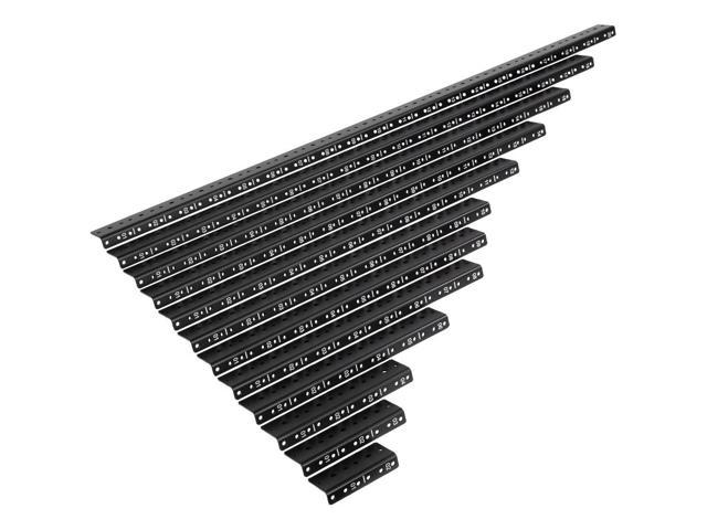 Multiple size mounting holes across entire lengthSilk screened Rack Unit measurements and pre-tapped with 12-24 threadingIncludes enough 12-24 screw sets to mount equipment in every rack space.