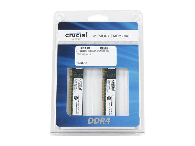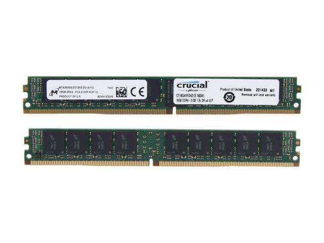 Features CT2K16G4VFD4213 is a 32GB Kit consisting of (2) 16GB DDR4 server modules that operates at speeds up to 2133 MT/s and has a CL15 latency. It is a Very Low Profile Registered DIMM (VLP RDIMM) with Error Correction Code (ECC). It conforms to the industry standard DDR4 VLP RDIMM layout of 288 pins and a PCB height of 18.75mm. It is compatible with systems that take DDR4 2133MT/s VLP RDIMM memory.