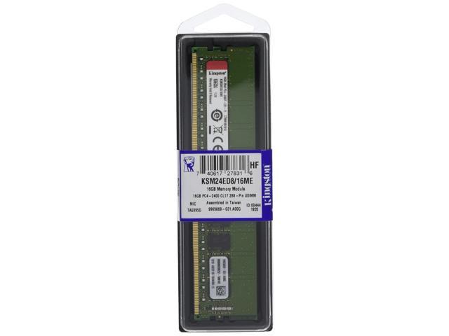 | Features | Kingston’s KSM24ED8/16ME is a 2G x 72-bit (16GB) DDR4-2400 CL17 SDRAM (Synchronous DRAM), 2Rx8, ECC, memory module, based on eighteen 1G x 8-bit FBGA components. The SPD is programmed to JEDEC standard latency DDR4-2400 timing of 17-17-17 at 1.2V. Each 288-pin DIMM uses gold contact fingers. |