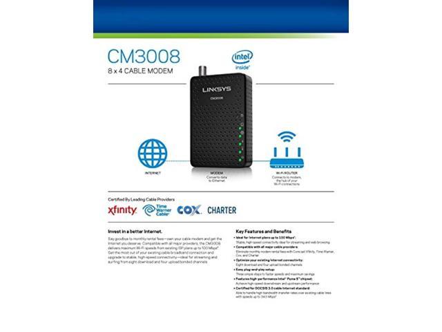 Compatible with Comcast Xfinity, Time Warner Cable, Charter, Cox, Cablevision, and more; Requires Cable Internet Service Not compatible with: Verizon, AT and T, or CenturyLink | Cable Modem only (no WiFi router) Features Intel Puma 5 chipset to achieve high speed downstream and upstream performance 8 download and 4 upload bonded DOCSIS channels give you the most out of your existing cable broadband connection