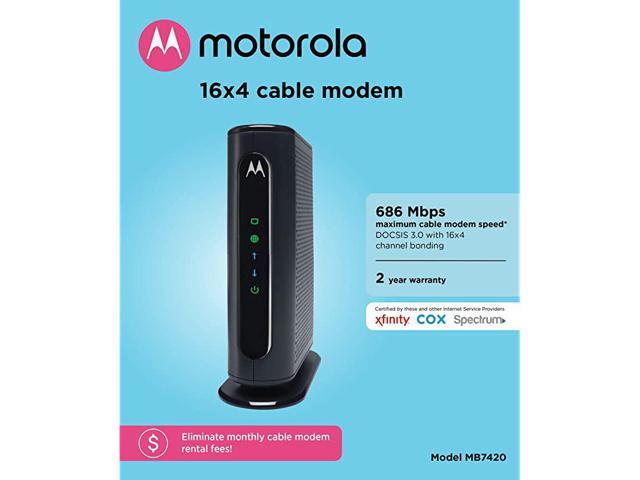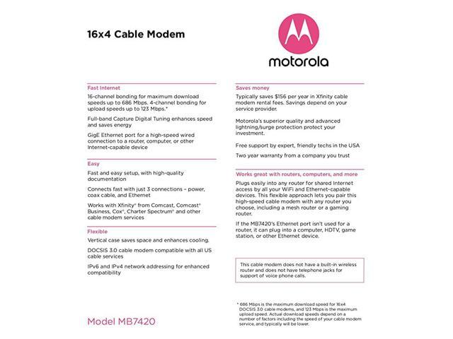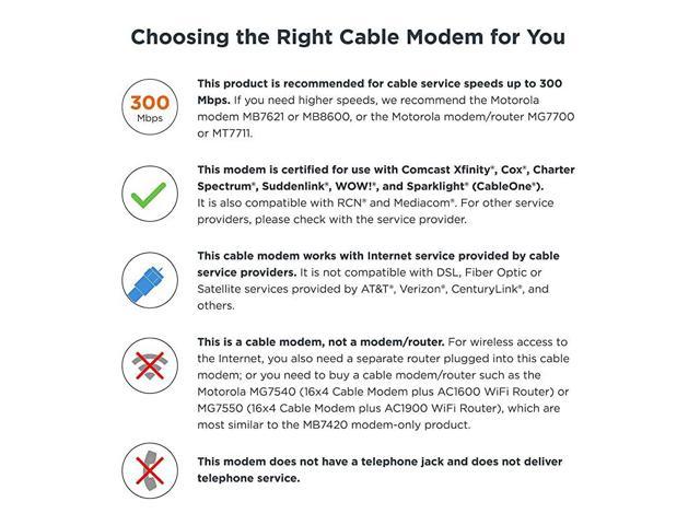 ******************** **********Best Quality Guranteed.**********This 16×4 DOCSIS 3.0 cable modem provides speeds up to 686 Mbps, sixteen times faster than DOCSIS 2.0. A Full-Band Capture digital tuner ensures a faster, more reliable Internet.**********Cable modem’s Ethernet port connects to a computer, HDTV, game station, or wireless router. (This Model MB7420 cable modem does NOT have a built-in wireless router and does NOT have a telephone adapter or phone jack. The MG7310, MG7315, MG7540 and MG7550 have a built-in wireless router.)**********Requires cable Internet service. Certified by Comcast XFINITY for residential speeds up to Extreme 300, by Comcast Business for speeds up to Deluxe 250, Time Warner Cable, Cox, Charter Spectrum, BrightHouse, and other leading cable service providers for modem ownership programs that typically save rental charges of $120 or more per year**********Setup is fast and easy with a few quick steps set out in a Quick Start guide. Experienced US