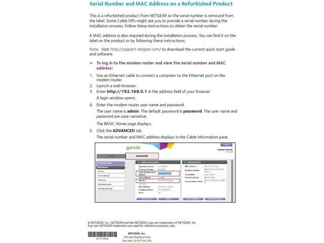 “Netgear Refurbished product may have a removed serial number. You will need to state the product is refurbished (state the full part number) if emailing customer support. See the attached (image) flyer to obtain the Serial Number and MAC Address information that maybe needed by your Cable provider before contacting them.”