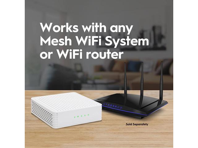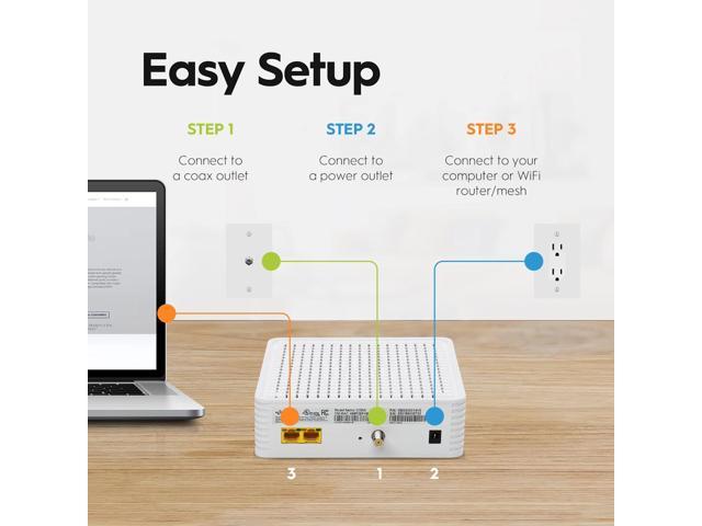 EASY TO SETUP… in 3 simple steps: Plug in the provided COAX cable to an active cable outlet, then connect the power supply. Plug in the Ethernet cable to your WiFi Router or WiFi Mesh system.