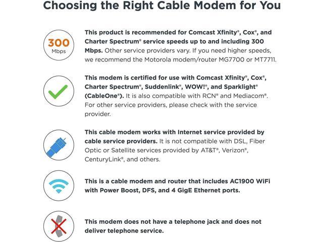 • Requires cable Internet service. Approved by and for use with Comcast Xfinity and Xfinity X1, Cox, Charter Spectrum, Time Warner Cable, Suddenlink, WOW., CableOne and other cable service providers. Eliminate cable modem rental fees up to 156 dollars per year. (Savings are shown for Xfinity and vary by cable service provider. No cable modem is compatible with fiber optic, DSL, or satellite services from Verizon, AT&T, CenturyLink, Frontier, and others. Model MG7550 has no phone jack.)