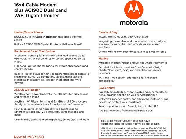 Mg7550 Modem Wifi Router Combo with Power Boost|approved by Comcast Xfinity, Cox, Charter Spectrum and More|for Cable Plans Up to 300mbps|ac1900 Wifi Speeds|16x4 Docsis 3.0