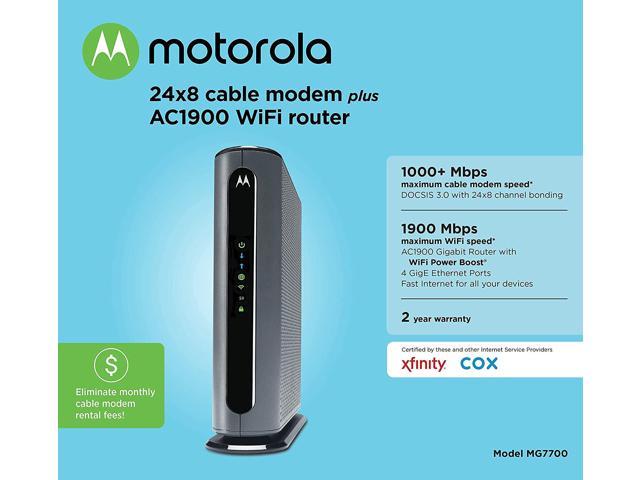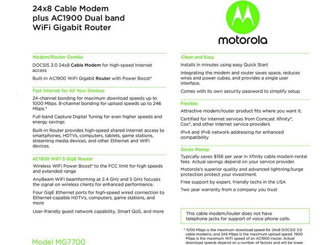 Fast 24×8 DOCSIS 3.0 cable Modem Plus a built-in AC1900 Dual band (2.4GHz and 5GHz) Wi-Fi Gigabit Router with four Gigabit (GigE) Ethernet ports, power boost Wi-Fi amplifiers, firewall security, and more. The maximum modem speed is 1000 Mbps, supporting service speeds up to 650.Eliminate up to 156 dollars per year in cable Modem rental fees. (Savings are shown for Comcast Xfinity and vary by cable service provider.) certified by all leading cable service providers including Comcast Xfinity, Cox, Charter spectrum Wireless power boost for better speed and range – Adds high-performance Wi-Fi power amplifiers to boost the wireless signals to the legal limit, giving a significant Boost in speed and range. In addition, anybeam Performing at both 2.4 GHz and 5 GHz frequencies focuses the signal on wireless clients to further enhance performance and range