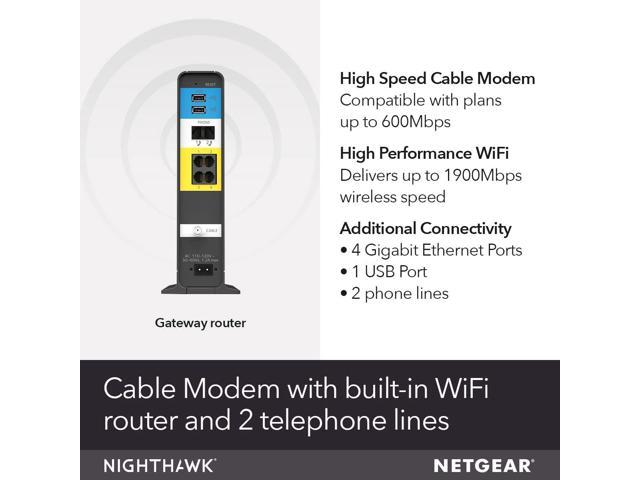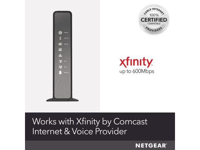 Compatible with Xfinity Cable & Voice Plans up to 600Mbps speed.Three-in-one DOCSIS 3.0 Cable Modem + AC1900 WiFi Router+ Xfinity Voice and 2 USB portsDOCSIS 3.0 unleashes 24x faster download speeds than DOCSIS 2.0Ideal for streaming 4K HD videos, faster downloads, and high-speed online gaming.Optional battery backup for power outages with up to 8 hours of standby and 5 hours of talk time2 Voice over IP (VoIP) Ports and 4 Gagabit Ethernet Port.System Requirements:Microsoft Windows 7, 8, Vista, XP, 2000, Mac OS, UNIX, or Linux.Microsoft Internet Explorer 5.0, Firefox 2.0, Safari 1.4 or Google Chrome 11.0 browsers or higher