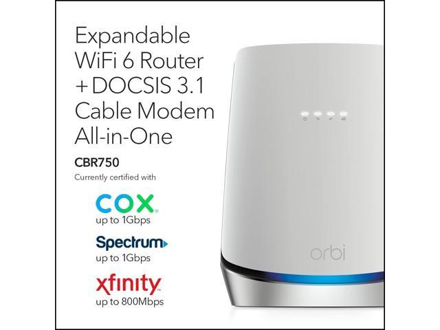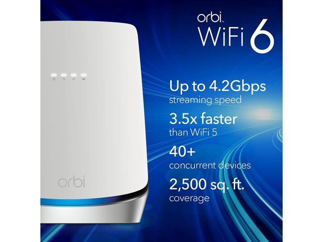 • Integrated cable modem and WiFi 6 router provides high-performance WiFi coverage for up to 2,500 sq. ft. and 40+ devices. Expand coverage by 2,500 sq. ft. with each optional Orbi Mesh WiFi 6 satellite (sold separately)