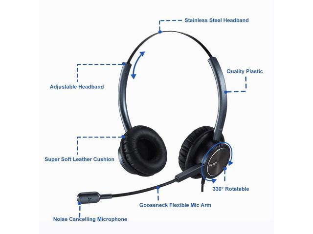 ALL-DAY COMFORT This telephone headset comes with large size soft leatherette ear cushions for super comfort wear. Adjustable headbands for different head sizes and 330° rotatable microphone boom enable you to find perfect fit.