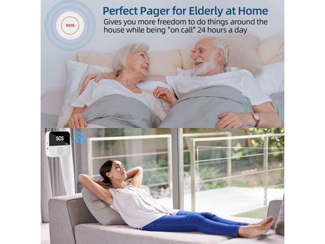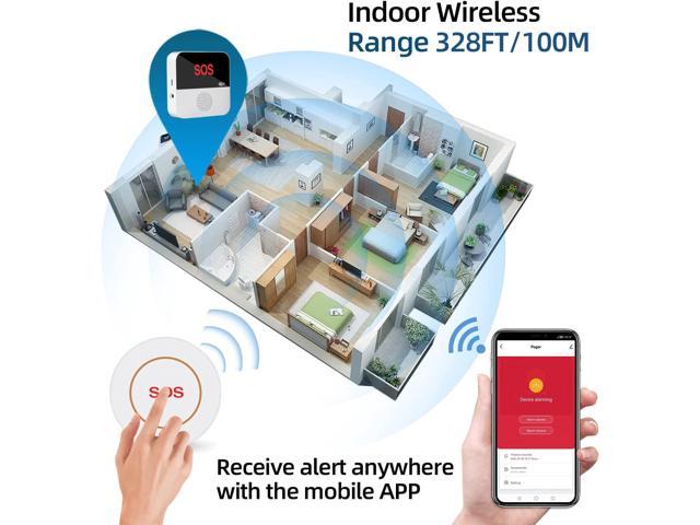 Long Range Pager The caregiver pager emits reliable signal, the alarm range in open area is 328ft/100M(the smart caregiver pager will not interfere with other devices, but the wall/metal will affect the receiving distance, please measure the actual distance when you receive the emergency alert system for seniors)