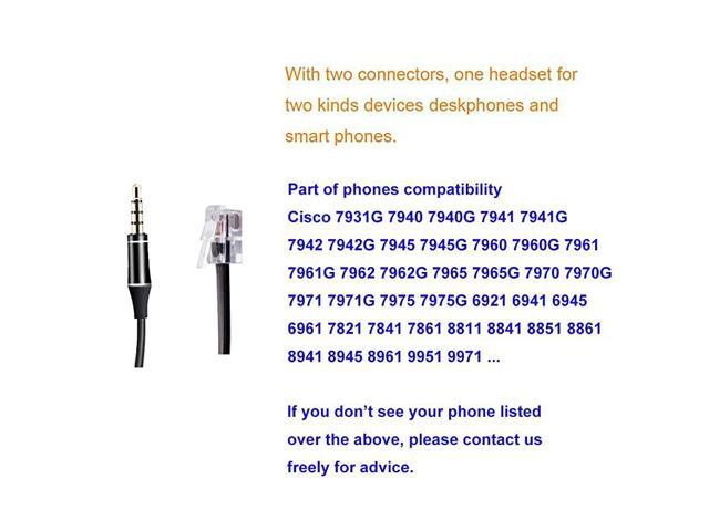 ***************Best Quality Guranteed.*****One Headset Mutilple Uses. This office headset can be used for both landline phones, cell phones and laptops. A headset comes with both RJ9 and 3.5mm connectors for desk phones and mobiles including iPhone Samsung and most other Androids. Headset with RJ9 connector for Cisco IP Phones: 7931G 7940 7940G 7941 7941G 7942 7942G 7945 7945G 7960 7960G 7961 7961G 7962 7962G 7965 7965G 7970 7970G 7971 7971G 7975 7975G 6921 6941 6945 6961 7821 7841 7861 8811 8841 8851 8861 8941 8945 8961 9951 9*****High Quality Sound: Phone headset with noise cancelling microphone and HD audio sound ensure easy and clear communication for call centers, offices and home phones even in noisy environment. Wideband audio solution offers natural and clear hearing. Anti acoustic shock for hearing protection.*****Super Comfortable Headset: RJ9 headset with super soft protein leatherette ear cushion,user-friendly hygiene, adjustable headband to fit for different head sizes,