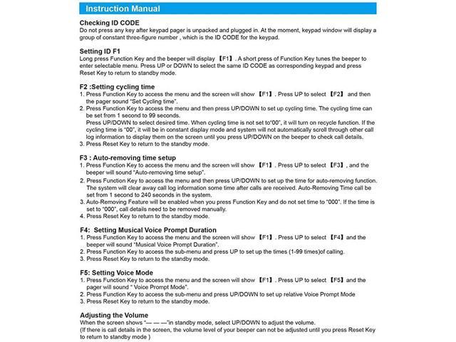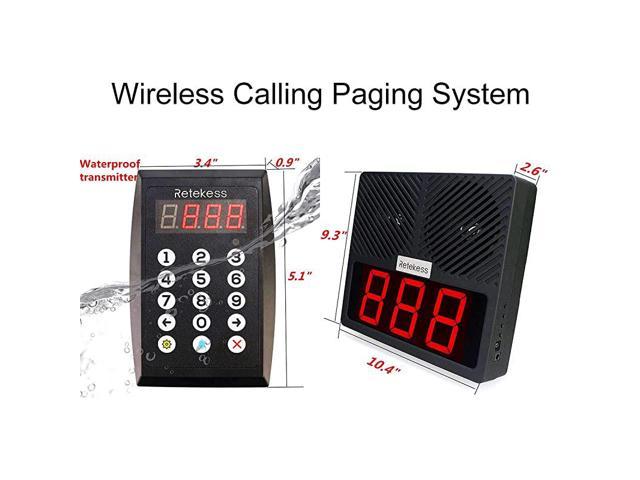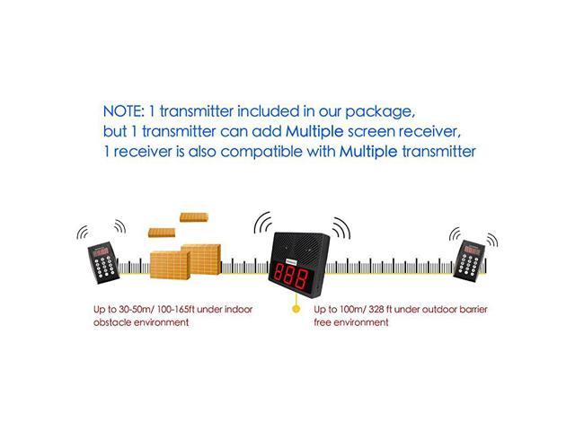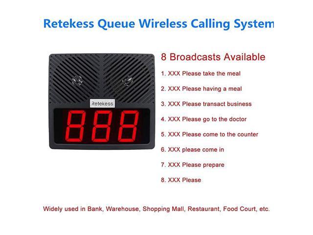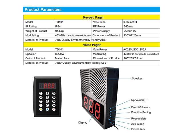 ******************** **********Best Quality Guranteed.**********8 Broadcast types for TD101 number calling system meets your multiple needs; larger LCD screen; easy to read even at a distance; calling records cycle time is adjustable; 1-99 times calling optional; no worry about customers miss the calling**********Screen receiver can be fixed on the wall by suspension grooves; also can stand on the table; up to 100m or 328 ft in open area; 30-50m or 100-165ft in obstacle field; is suitable for restaurant; food court; 4S store; bank; factory; shopping mall; cafe; food truck; clinic or other queue and noisy occasions**********Double loudspeaker for the restaurant calling system; more clear voice; 10 level adjustable; also support any 3.5mm jack sound; which can enlarge the broadcast; no need to worry about that customers cannot hear the page sound; both screen receiver and call buttons custom quantity**********Waterproof and oil resistant integral keyboard; no button gap between