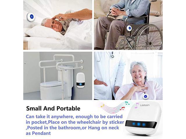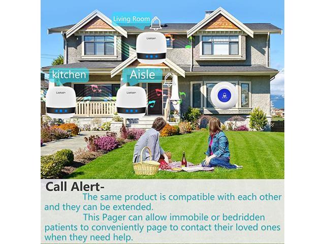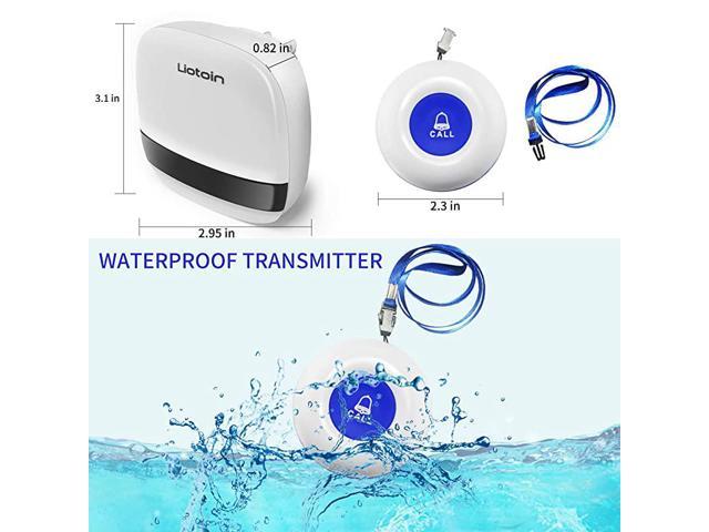 ********************Three call buttons and three pagers, One of which is touch screen button, Which is convenient for patients with relatively small strength to use. You can call for help by gently touching. Simply press any call button to alert the caregiver via the wireless receiver.**********Using adaptive high-frequency technology, More anti-interference than the ordinary doorbell over 600ft/180m in the open area, Strong penetration and signal stability, Can penetrate a few walls.**********Transmitter/Push Call Button is easy carry. It can be put in pocket. Or hang on neck as pendant. Neck strap included. Fixed in Bedside/Washing Room. The fixed bracket and double sticker are included**********Pager/Chime Unit has 36 ring tones for your choice.5 Level adjustable volume from 0db to 110db,Silent mode with LED flash is available.Easy use ( Plug and Play) plug the receiver into an electrical outlet**********Transmitter/Push Call Button is waterproof. Acceptable for meal/soup Sp