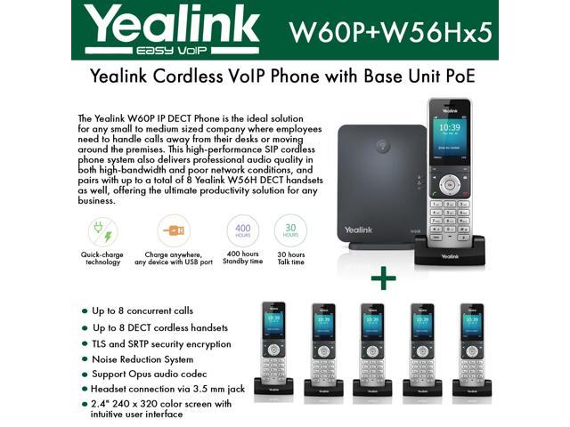 Yealink W56H (5-UNITS) The Yealink W56H is the next-generation wireless handset designed for business use with excellent battery life and high compatibility. Combining the benefits of wireless communication with rich business features of Voiceover-IP telephony, it empowers users with convenience of wireless communication that users can enjoy conversations in excellent speech quality, benefit from freedom of movement and its professional features. The attractive design with 2.4″ color screen underlined by its modern look is what defines this state-of-the-art VoIP wireless telephone.