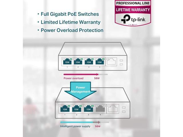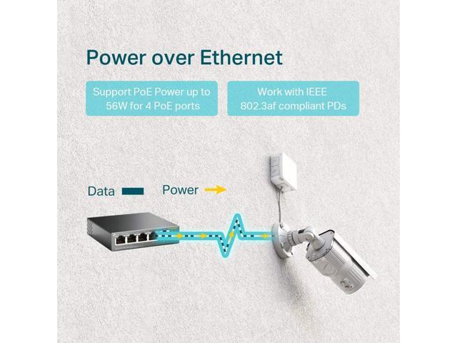 5 10/100Mbps RJ45 portsWith four PoE ports, transfers data and power on one single cableWorking with IEEE 802.3af compliant PDs, expands home and office networkSupports PoE Power up to 15.4W for each PoE portSupports PoE Power up to 58W for all PoE portsRequires no configuration and installation