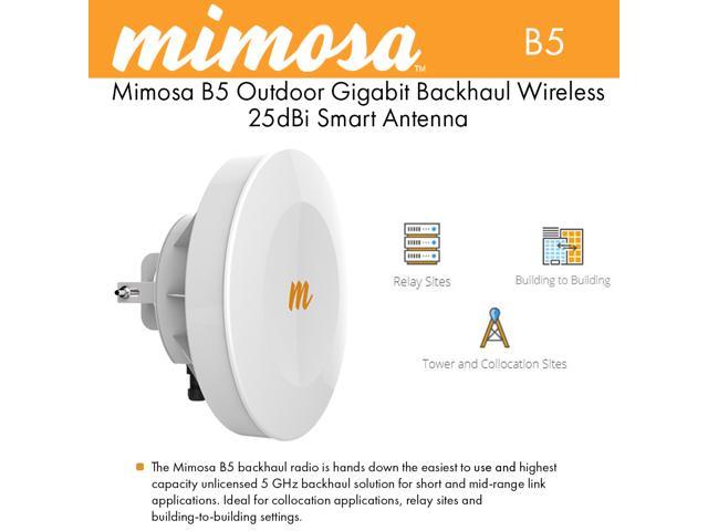 Advanced security: 128-bit AES- PSK. Up to one million packages per second. EASILY ADD NEW LINKS Typical backhaul solutions waste spectrum with each link installed and impact network capacity. The unique high-precision GPS synchronization technology allows the Mimosa B5 and B5c products to reuse the same channel throughout the network, and up to 4 links can be automatically coordinated. DOUBLE RELIABILITY Unlicensed spectrum can be unpredictable. Therefore, Mimosa custom designed a unique multi-channel and automatic technology to protect its links when it encounters interference. The B5 and B5c automatically maintain their links with two independent operating channels and adapt using our auto-everything technology to proactively resolve problems to provide optimal link speed and reliability. It’s like 2 smart links in a single radio. INCREDIBLY FAST, INCREDIBLY FLEXIBLE. Awarded as the fastest unlicensed backhaul in the industry, the B5 and B5c also offer broad bandwidth control options. Dynamic modes automatically adapt to traffic demand and provide an ultra-low link latency of ~ 1 ms for confidential voice and video communications services. While reserved bandwidth and GPS synchronization modes allow asymmetric reservation or 75/25 in the direction of traffic.