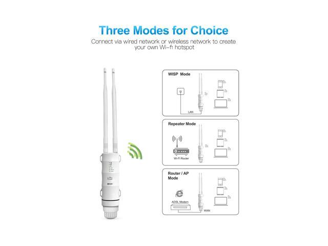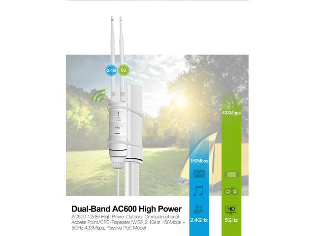The AC600 HighPower Wi-Fi AP/Repeater is mainly used for providing free Wi-Fi service in big area such as factory, community, street or etc. The AP/Repeater can take an existing 2.4GHz or 5GHz wireless signal, repeat and extend it to a longer range where it is too far away for the router or access point to reach. The AP/Repeater simultaneously supports 2.4G and 5G wireless network connection, and it can supports 2.4G and 5G transmission speeds of up to 600Mbps. It has 2 x External Antennas providing even better wireless performance, transmission rates, stability technology automatically avoids channel conflicts using its channel selection feature.