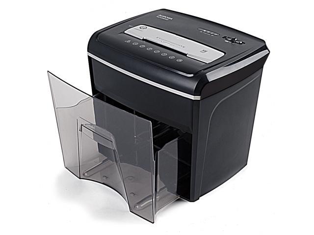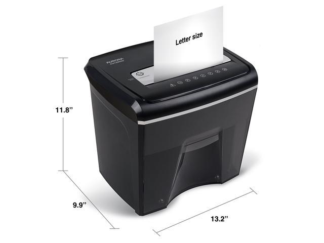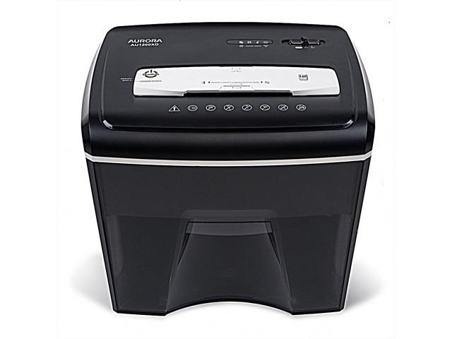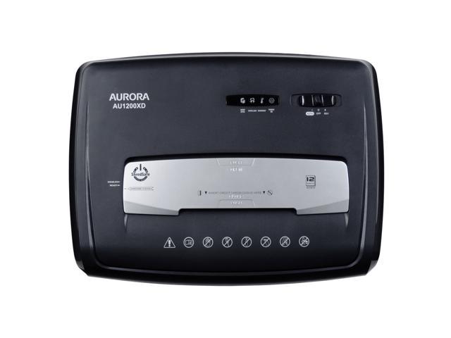 Aurora AU1200XD Compact Desktop-Style 12-Sheet Crosscut Paper and CD/Credit Card/ Junk Mail Pullout Basket Shredder * Crosscut with 12 sheet capacities; destroys CDs, DVDs, credit cards, junk mail, staples and small paper clips * Shreds paper, CDs, DVDs, credit cards, junk mail into small pieces (5/32 by 1-7/32 inches), security level P-4 * Anti-jam Auto-reverse to clear paper jams; Nonstop 5-minute continuous run time; Ultra-quiet operation. * “ShredSafe” advanced safety feature auto power-off upon forced entry, prevent accidents. * 1.8 -gallon translucent pullout bin with LED indicator lights Standby/ Overheat/ Overload/ Door open status * Measures 11.8 H x 13.2 W x 9.9 D inches