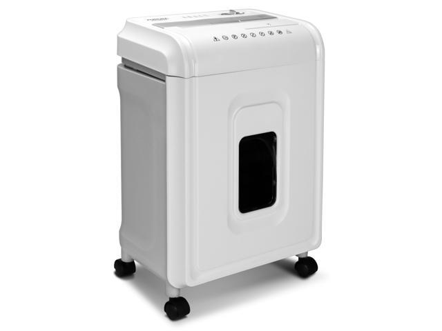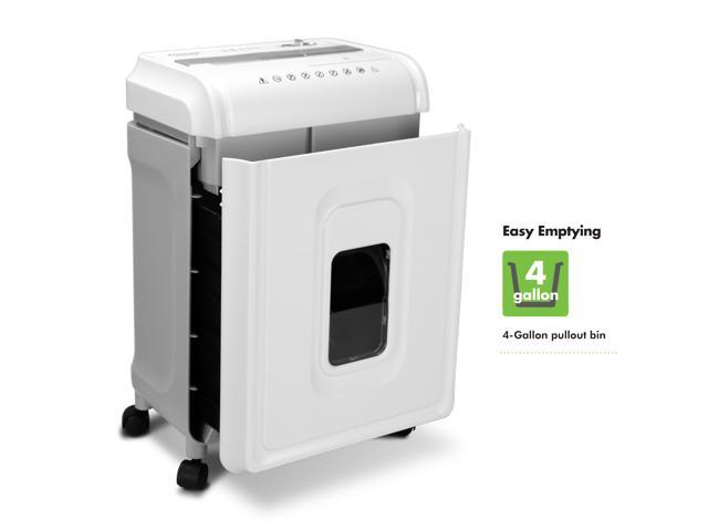 • Crosscut with 12 sheet capacities; destroys CDs, DVDs, credit cards and small paper clips• Shreds paper, CDs, DVDs, credit cards into small pieces (3/16 by 1-3/32 inches), security level P-4• Anti-jam Auto-reverse to clear paper jams; quiet operation• Nonstop 6-minute continuous run time • 4-gallon pullout bin with LED indicator lights Standby/ Overheat / Overload/ Door open/ Bin-full status; moving casters included
