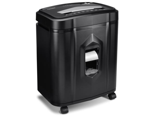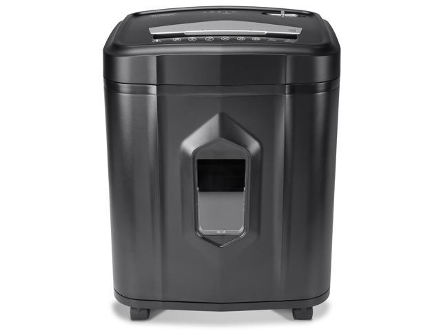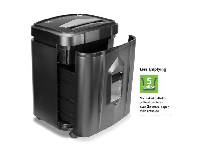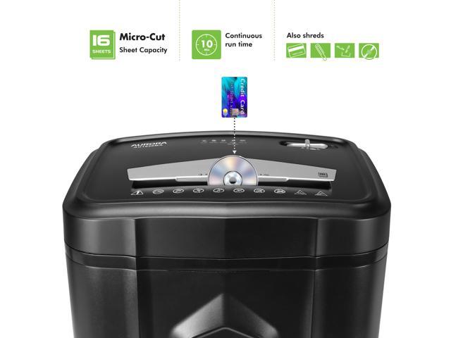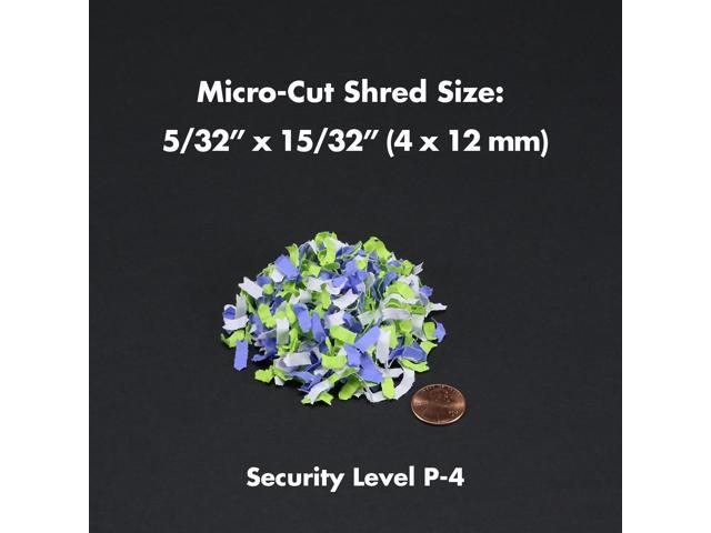 High Security Micro-Cut with 16 sheet capacities; destroys CDs, DVDs, credit cards and small paper clips.Shreds paper, CDs, DVDs, credit cards into small pieces (5/32 by 15/32 inches), security level P-4.Nonstop 10-minute continuous run time.Anti-jam Auto-reverse to clear paper jams; ultra-quiet operation5-gallon pullout bin with LED indicator lights Standby/ Overheat / Overload/ Door open/ Bin-full status; moving casters included