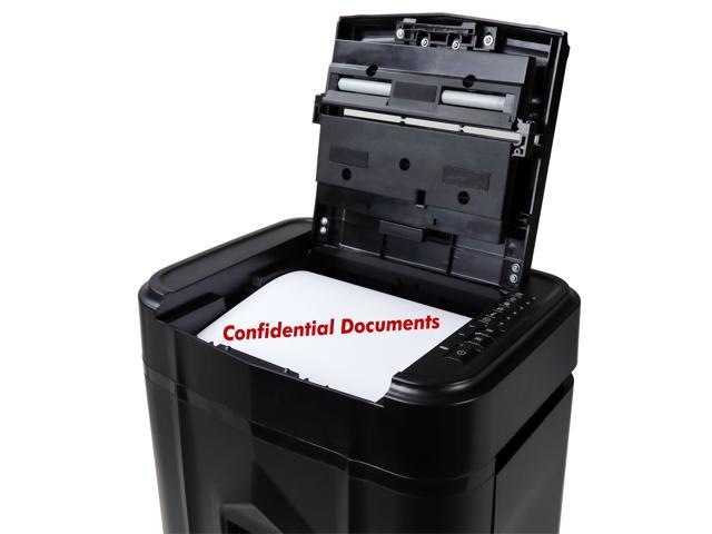 Automatic shredding feature for optimal efficiency, maximum 120 sheet automatic shredding and 10 sheet manual shredding capacityHigh security micro-cut shreds paper and credit cards into small pieces (5/32 by 15/32 inches), security level P-4Nonstop 30-minute continuous run timeFeatures automatic start and stop, jam prevention auto reverse, and overload protection. Ultra-quiet operation5-gallon pullout bin with LED indicator lights Standby/ Overheat/ Bin-full/ Overload/ Feed Error/Door open status