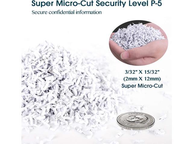 • SUPER MICRO CUT HIGH SECURITY LEVEL p5 paper shredder to secure confidential information. The paper slot blade shreds max 10-sheet paper or a credit card into particles measuring 3/32″ x 15/32″ (2mm x 12mm); The CD slot blade cut one CD or a credit card into 3 strip pieces