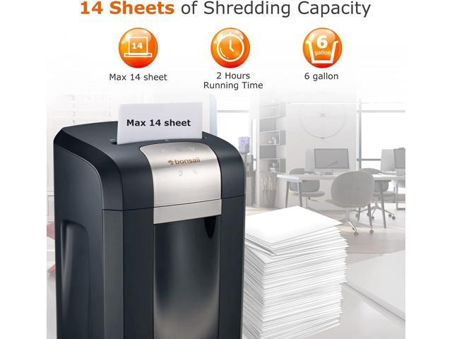 Continuous running time up to 120 minutes without stopping for mass documents destroying;Quiet operation :58 dB low noise level will give you a quiet and smooth shredding experience. High-security and heavy duty cross-cut paper shredder with 14 sheets (Letter Size, 20lb) shredding capacity; Shreds paper into tiny particles measuring 5/32 by 1-3/8 inches (4mm x 35mm),Security level P-4. Shreds paper, credit card, CD/DVD, clips, staples; Shredding speed reaches 7.2 feet per minute;Backed by 3 years warranty. 6 gallons large pull-out wastebasket capacity for easy and less frequent emptying, a 0.37 gallons separate small bin for CD/DVD and credit card pieces collection, and the transparent window makes it easy to see when wastebasket is full. Equipped with the casters, heavy duty shredder can be moved flexibly.