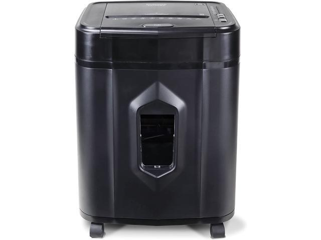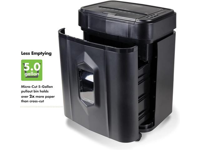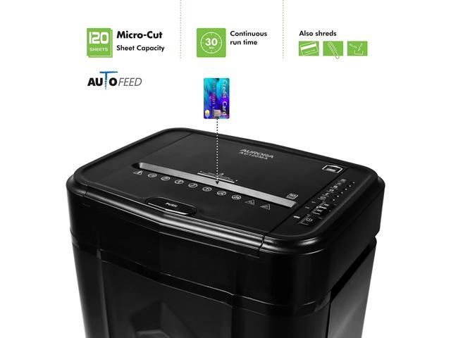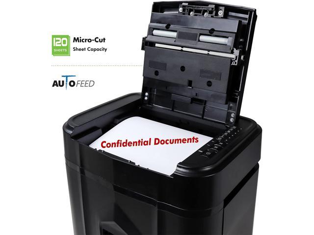 Automatic shredding feature for optimal efficiency, maximum 120 sheet automatic shredding and 10 sheet manual shredding capacity. High security micro-cut shreds paper and credit cards into small pieces (5/32 by 15/32 inches), security level P-4. Nonstop 30-minute continuous run time. Features automatic start and stop, jam prevention auto reverse, and overload protection. Ultra-quiet operation. 5-gallon pullout bin with LED indicator lights Standby/ Overheat/ Bin-full/ Overload/ Feed Error/Door open status.