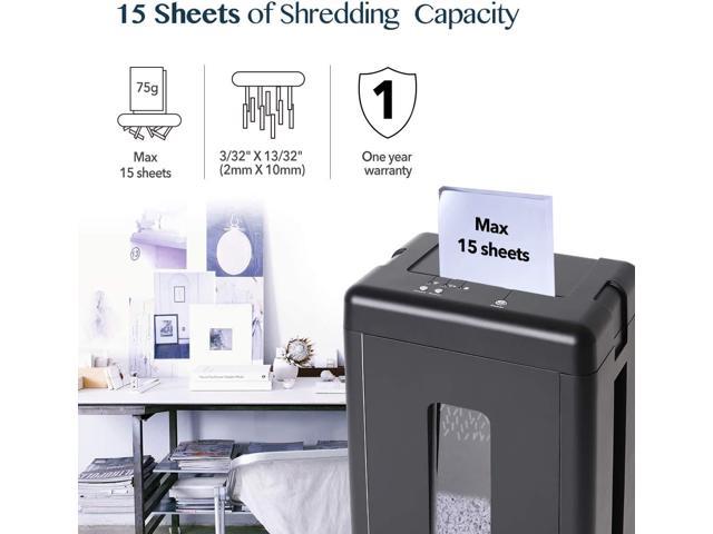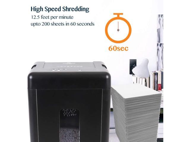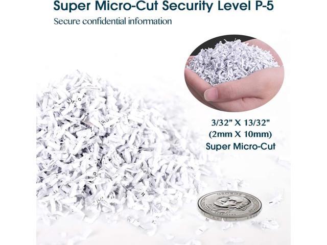 SUPER MICRO CUT HIGH SECURITY LEVEL p5 paper shredder to secure confidential information. Shreds max 15-sheet paper/staples/clips/CDs/credit cards into tiny particles measuring 3/32″ X 13/32″ (2mm x 10mm) HIGH SPEED HEAVY DUTY shredder shreds up to 200 sheets in 60 seconds or 12.5 feet per minute; 8 gallons pull-out waste bin with large transparent window INDUCTION MOTOR ULTRA QUIET paper shredder for home office at a low noise level less than 56dB with dual thermal protector keeps sustainable using and prolong shredders lifetime POWERFUL MANGANESE Cutter shreds through staples, paper, clips, CDs, credit cards and junk mails at ease.It doesnt need to be lubricated Its ETL listed for safety with one year warranty