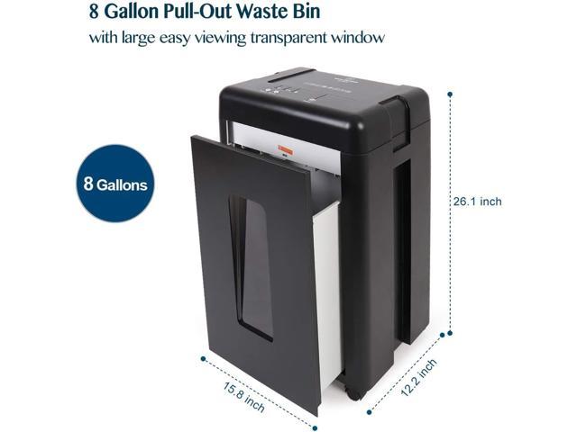 HIGH SPEED HEAVY DUTY shredder shreds up to 200 sheets in 60 seconds or 12.5 feet per minute; 8 gallons pull-out waste bin with large transparent window