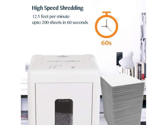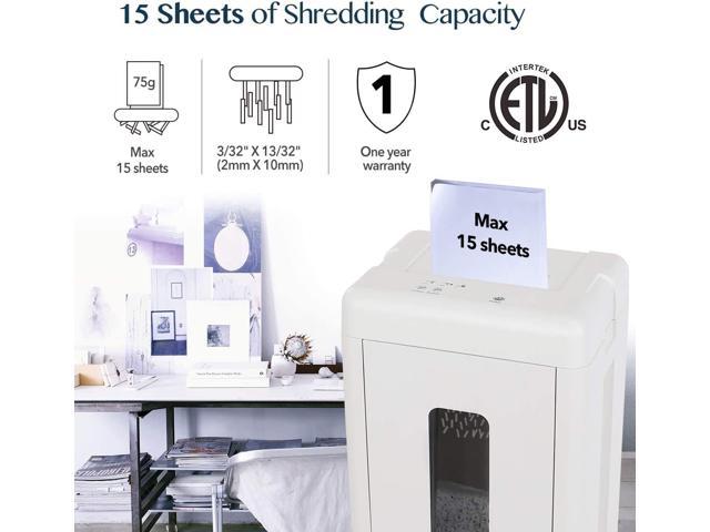SUPER MICRO CUT HIGH SECURITY LEVEL p5 paper shredder to secure confidential information. Shreds max 15-sheet paper/staples/clips/CDs/credit cards into tiny particles measuring 3/32″ X 13/32″ (2mm x 10mm) HIGH SPEED HEAVY DUTY shredder shreds up to 200 sheets in 60 seconds or 12.5 feet per minute; 8 gallons pull-out waste bin with large transparent window INDUCTION MOTOR ULTRA QUIET paper shredder for home office at a low noise level less than 56dB with dual thermal protector keeps sustainable using and prolong shredders lifetime POWERFUL MANGANESE Cutter shreds through staples, paper, clips, CDs, credit cards and junk mails at ease.It doesnt need to be lubricated Its ETL listed for safety with one year warranty