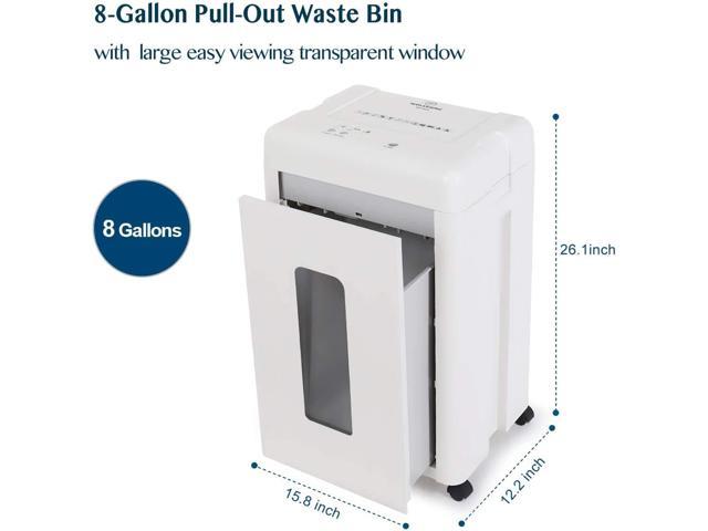 HIGH SPEED HEAVY DUTY shredder shreds up to 200 sheets in 60 seconds or 12.5 feet per minute; 8 gallons pull-out waste bin with large transparent window