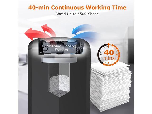 Paper Shredder for OfficeBased on the patented cooling system and high-efficiency motor, the paper shredder for office heavy duty runs continuously for 40 mins without stopping and destroys about 4500 sheets of paper. Commercial grade micro-cut paper shredders for Large office, small office and home office use.