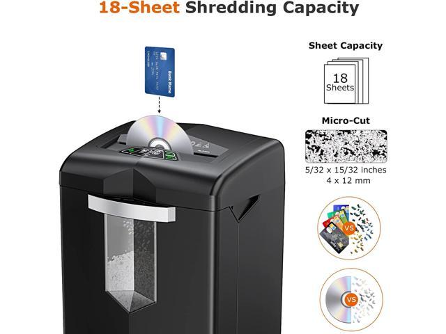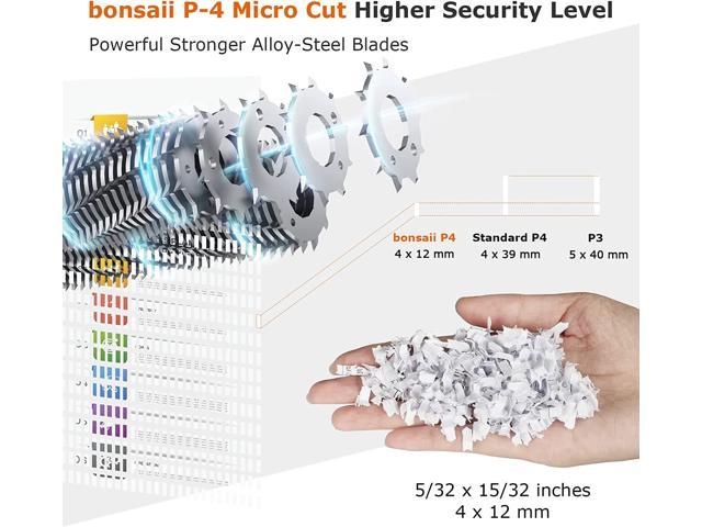 Shredder for Office Heavy Duty Max 18 sheets of paper shredding capacity, bonsaii heavy duty office shredder can efficiently shred CD, credit card, junk mails, staples and clips into tiny particles of 5/32 x 30/64 inches (4 x 12mm). Higher security level P-4 micro shredder can better protect your personal/business confidential information safety.