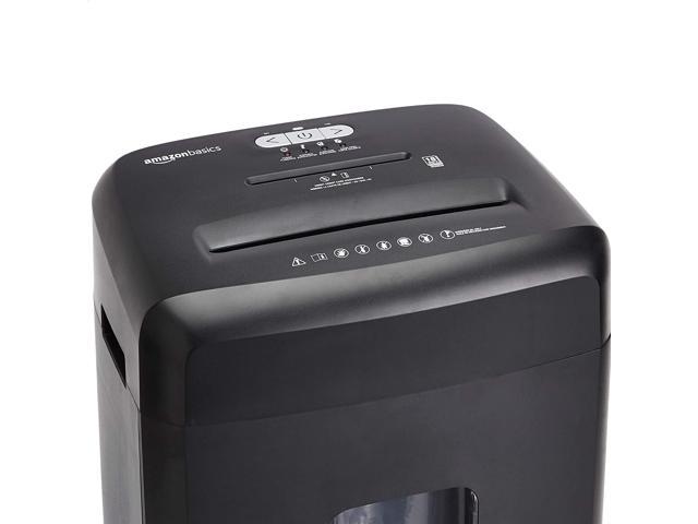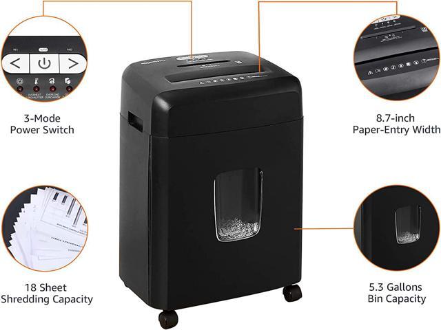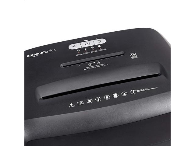 Cross-cut shredder turns paper into small confetti-like pieces measuring 4 by 35 mm; meets security level P-3 standardsShreds up to 18 sheets of 20-pound bond paper at a time (no need to remove staples or small paper clips); also destroys CDs, DVDs, and credit cards (one at a time, through dedicated slot)30 minutes on / 10 minutes off; if shredder runs continuously beyond the max run time, it will automatically shut off to protect the motor from overheating3 push-button controls (power/auto, forward, and reverse); LED status indicators (power, overheat, overload, and door open); 6 gallon bin with window; casters includedQuality tested: as part of Amazon Basics quality inspections, we test every shredder before shipping it, which means you may see some paper shreds from the testingDimensions 14.45 x 10.4 x 20.28 inches (LXWXH); weight 25.7 pounds