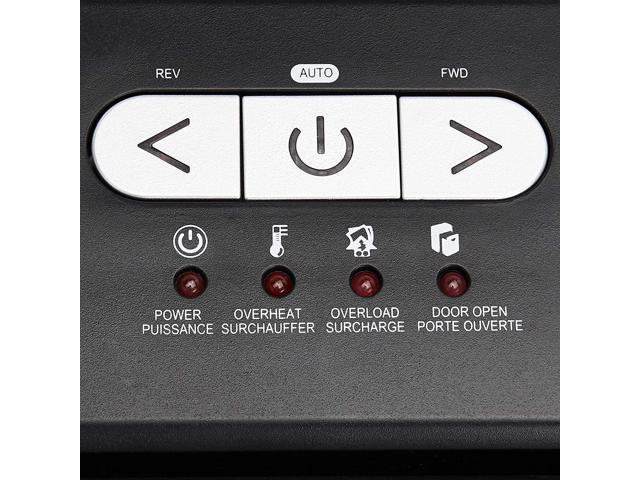 3 push-button controls (power/auto, forward, and reverse); LED status indicators (power, overheat, overload, and door open); 6 gallon bin with window; casters included