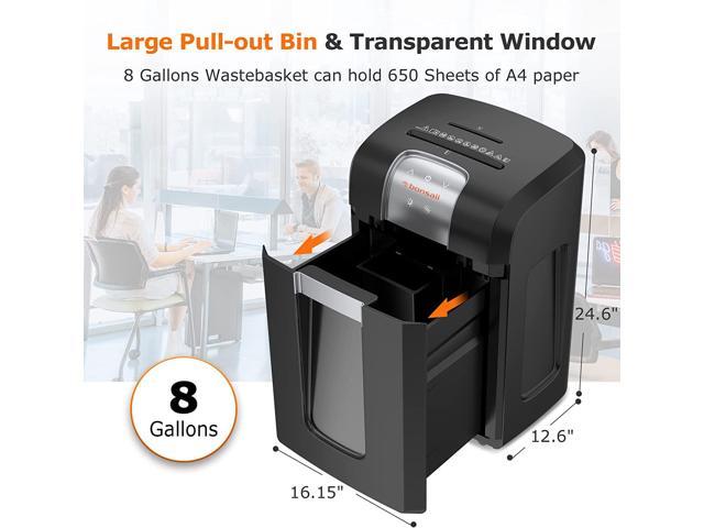 • Large & Pull out Bin8 gallons large pull-out wastebasket capacity for easy and less frequent emptying, the 0.37 gallons separate small bin for CDs and credit card pieces collection, and the transparent window makes it easy to see when wastebasket is full. Equipped with the casters, commercial heavy duty shredder can be moved flexibly.