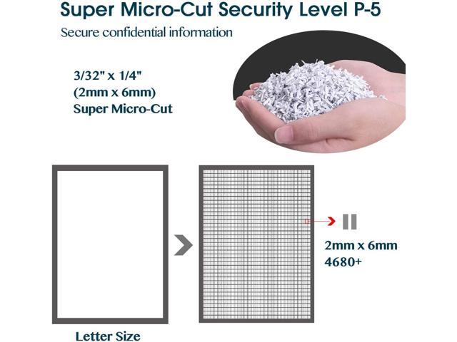 • SUPER MICRO-CUT SECURITY LEVEL P-5 paper shredder to secure confidential information. Shreds max 6-sheet paper/staples/clips/credit cards into tiny particles measuring 3/32″ x 1/4″ (2mm x 6mm)