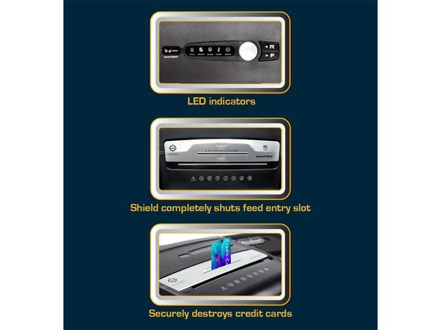 10 sheet micro cut with 5 gallon pullout basket Advanced Jam Free technology eliminates paper jams Shred safe advanced safety feature auto power off to prevent accidents Shreds CDs/DVDs, Credit cards, Small paper clipsm, StaplesOverload / Overheat protection.Paper Shred Size:5/32″ x 15/32″ Auto start/stop/overload/overheat protection LED indicator lights Power/ Overheat/ Overload/ Misaligned status