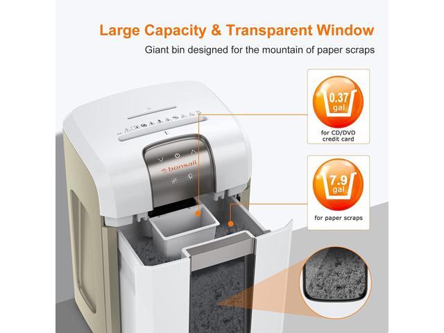 • Large Capacity Pull Out BinWith a 7.9 gallons large pull-out wastebasket, this high capacity shredders for office heavy duty could hold a lot of paper scrapes by seeing through transparent window and reduce emptying times. Also, installing a 0.37 gallons separate small bin is to collect CD/DVD and credit card pieces
