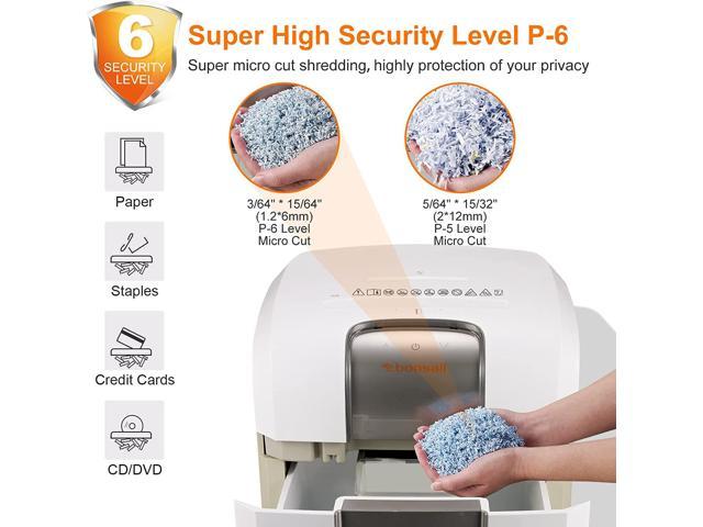 • P-6 High Secutiry LevelEquiped with dual solid alloy steel cutter, bonsaii super micro cut shredder shred paper into tiny particles measuring 3/64 by 15/64 inches (1.2*6mm), highly effective protecting personal information